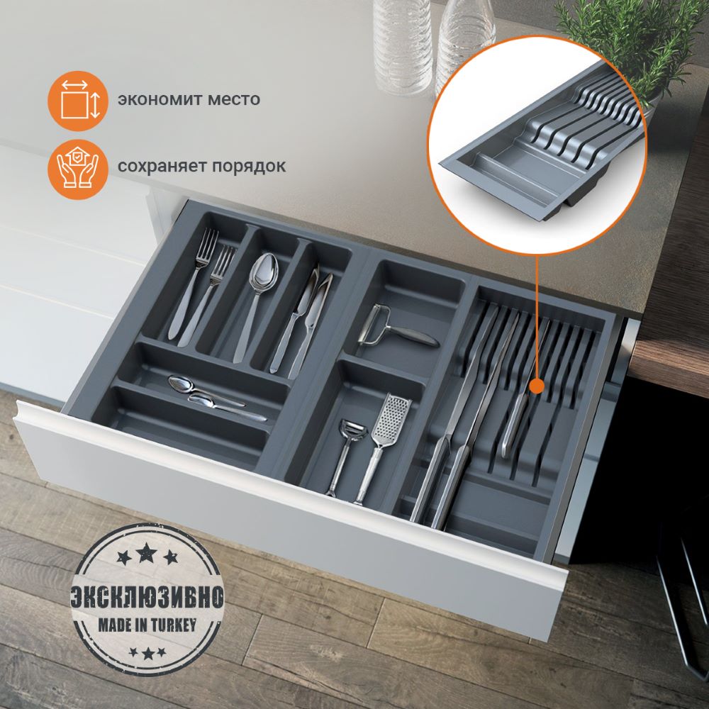 • Насечки по периметру изделия для ровного обрезания ширины и глубины лотков под размер кухонного ящика.