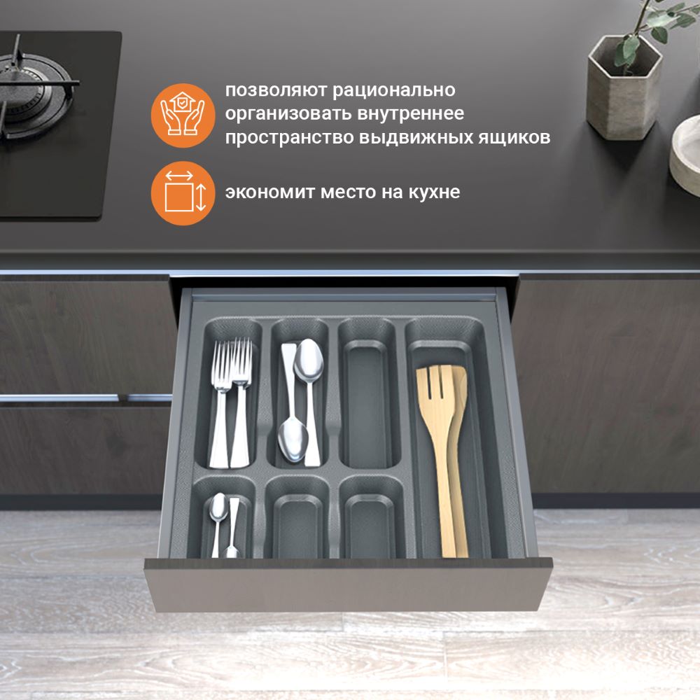 Лотки для столовых приборов EVA позволяют рационально организовать внутреннее пространство выдвижных ящиков. Цвета: серый и белый глянец. Для ящиков шириной 400 мм.