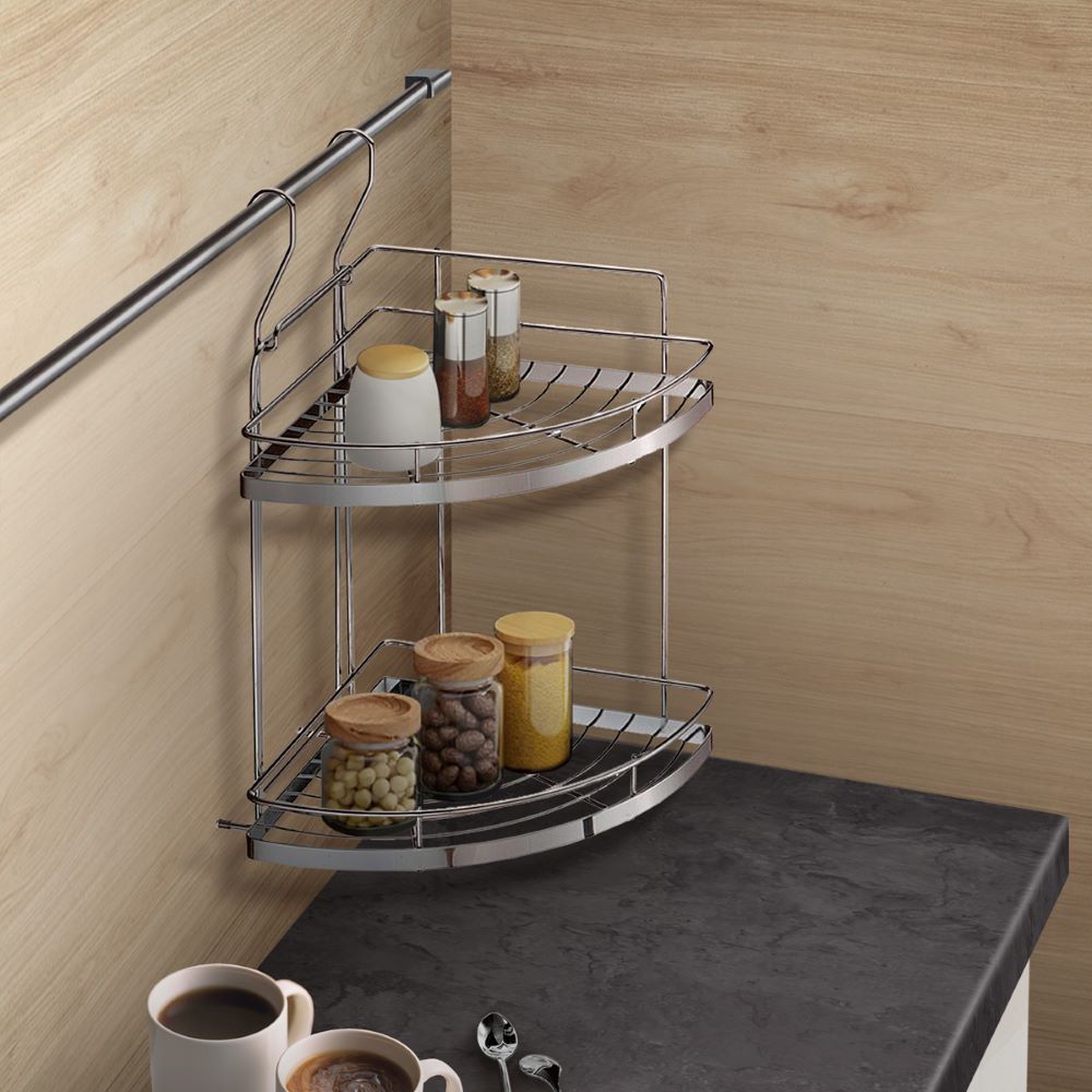 Двухъярусная угловая полка Lemax для рейлинговой системы. Эффективно задействует угловое пространство и позволяет разместить большое количество нужных в хозяйстве аксессуаров и продуктов. Помогает поддерживать порядок на кухне, не загромождая пространство. Выдерживает значительную статическую нагрузку. Специально разработанное покрытие изделия не боится влажности и позволит сохранить идеальный вид на долгие годы.